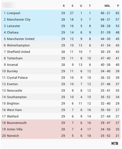 Om man stopper sesongen der, så vil i så fall Liverpool bli mestere, Norwich og Bournemouth vil rykke ned, og kampen mellom Aston Villa og Sheffield United vil få enorm betydning.